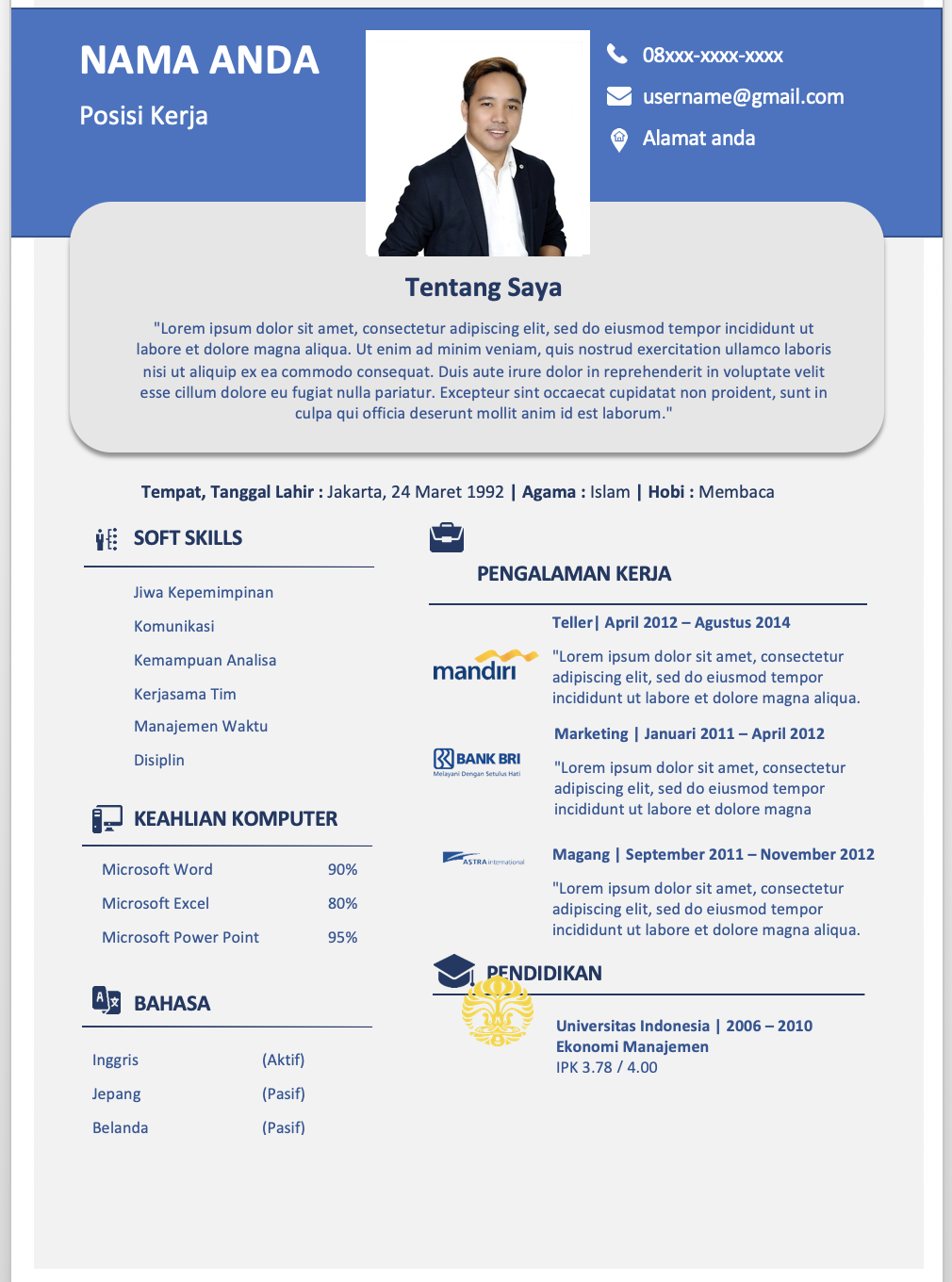 Jika Anda baru lulus dan ingin melamar di BUMN, tentu membutuhkan contoh CV BUMN fresh graduate sebagai acuan dalam menyusun CV. Berikut adalah contoh CV BUMN fresh graduate yang dapat Anda gunakan: